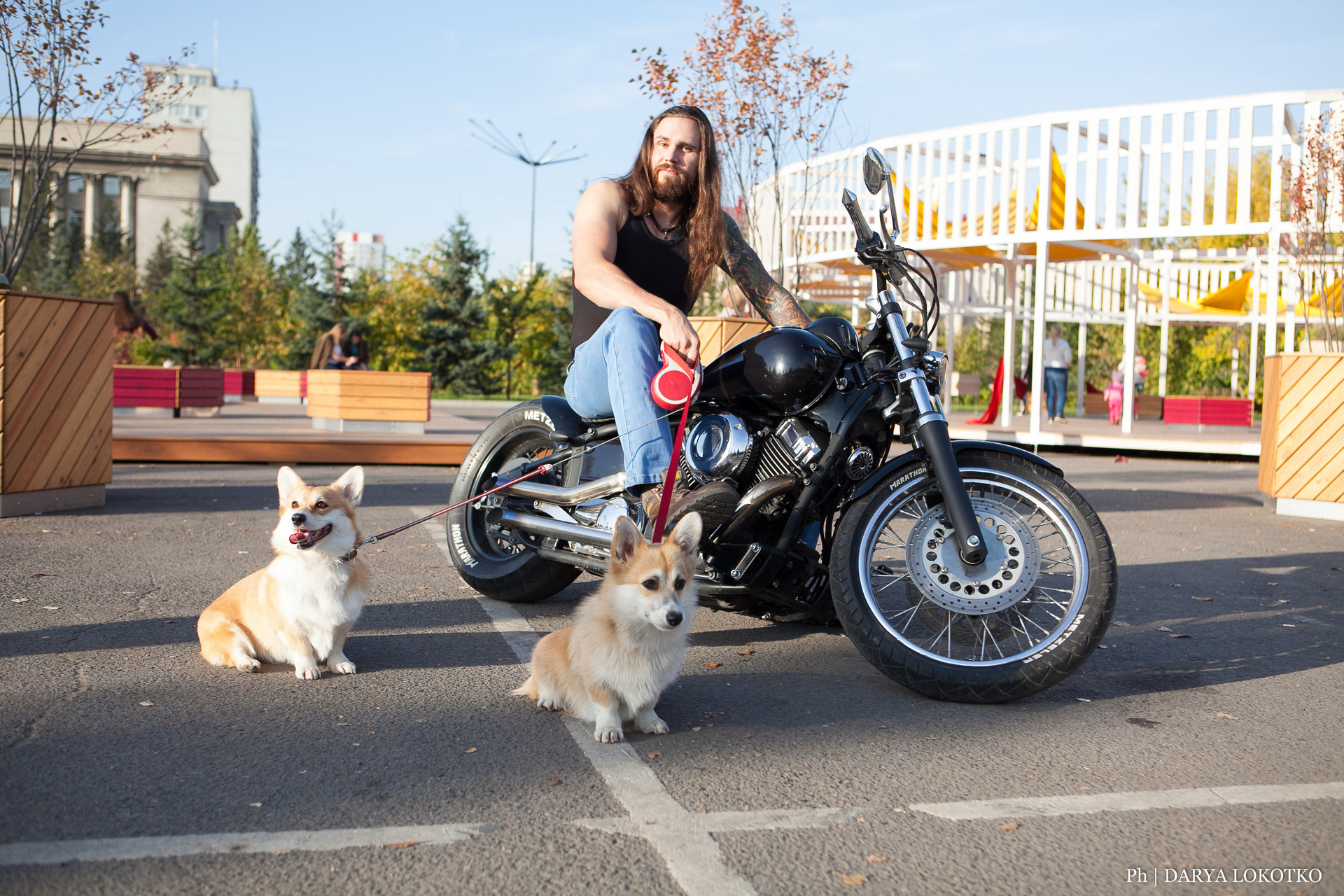 байкер парень мотоцикл руль чоппер фотосессия город лето корги
